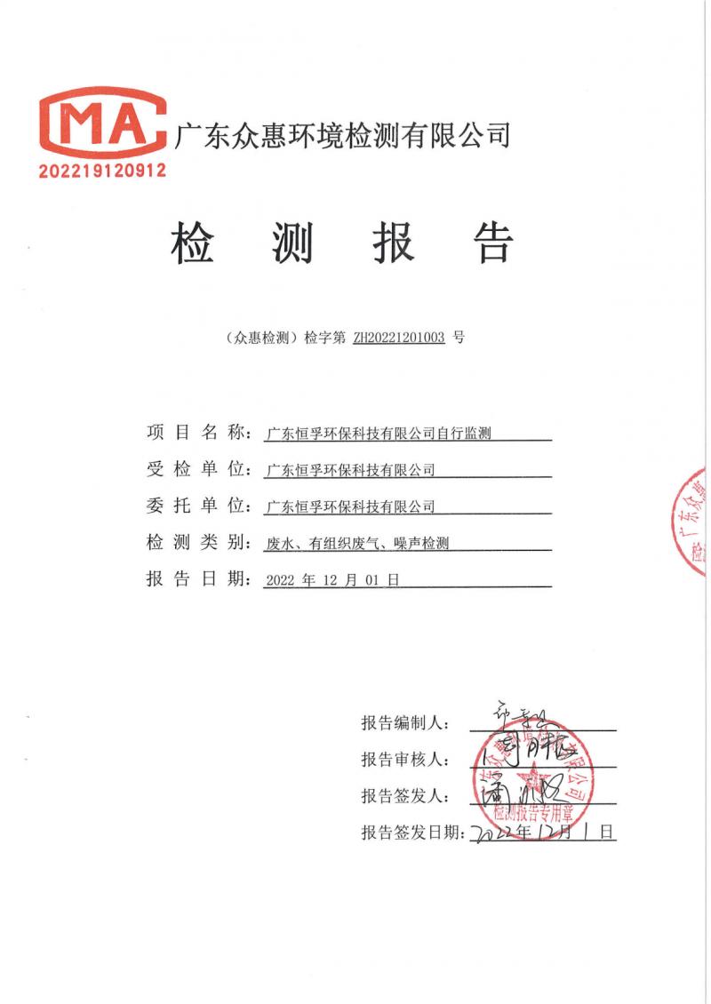 (恒孚)22年11月雨水、有组织废气。噪声检测报告ZH20221201003