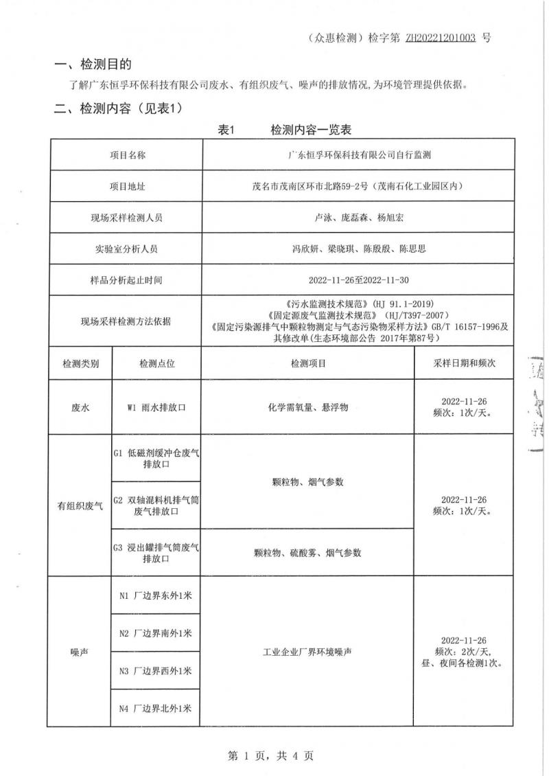 (恒孚)22年11月雨水、有组织废气。噪声检测报告ZH20221201003